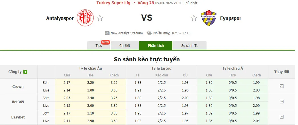 Nhận định soi kèo Antalyaspor vs Eyupspor, 21h00 ngày 5/4 tại VĐQG Thổ Nhĩ Kỳ. Phân tích tỷ lệ kèo, dự đoán kết quả Antalyaspor đấu với Eyupspor từ tỷ lệ châu Âu, châu Á qua các chuyên gia hàng đầu.