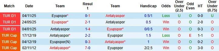 Antalyaspor thua kèo 3 trong số 4 trận đấu mới đây chạm mặt Eyupspor. Antalyaspor không thắng kèo 3 trong số 4 trận đấu mới nhất. Eyupspor thắng kèo tới 5/7 trận sân khách mới đây tại mọi mặt trận.