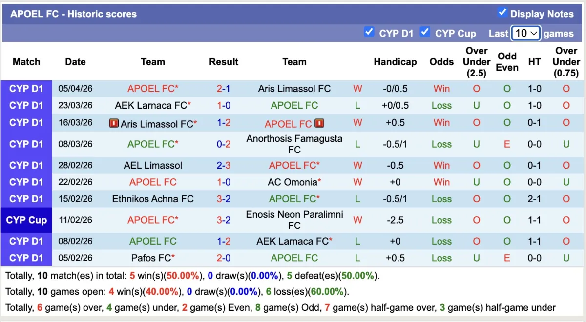 -Thống kê phong độ 10 trận đấu gần nhất của APOEL