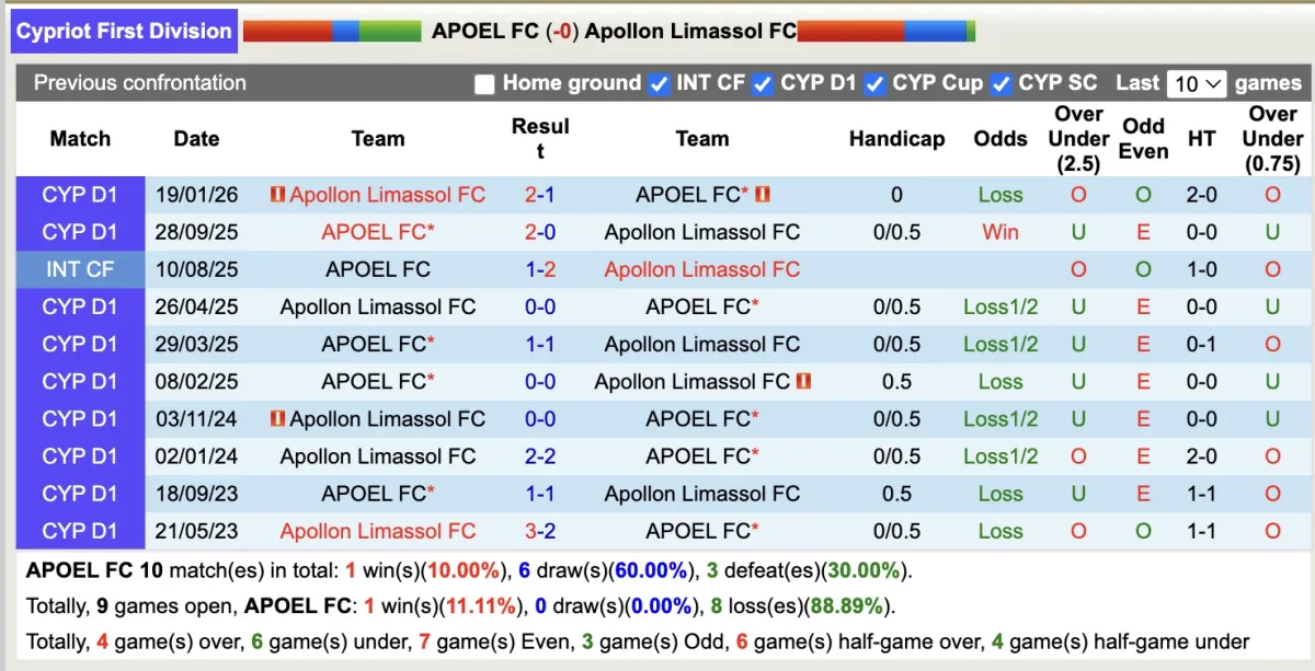 Trong quá khứ đối đầu giữa hai câu lạc bộ, những lần các nhà đầu tư đặt niềm tin vào APOEL từ năm 2023 đến nay đều nhận về sự thất vọng. Cụ thể 10 lần chạm trán giữa hai đội bóng ở giải VĐQG, đội chủ nhà chỉ 1 lần thắng kèo và thua kèo đến 9.
