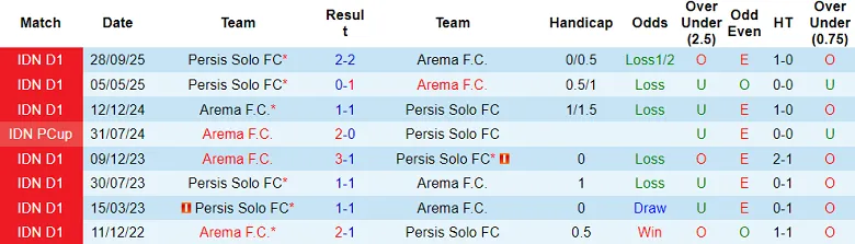 Toàn bộ 3 trận sân khách vừa qua thuộc khuôn khổ Indonesia Liga 1 của Persis Solo đều không xuất hiện nhiều hơn 2 bàn thắng. Kịch bản quen thuộc ấy dự kiến tái diễn khi Persis Solo cùng Arema thi đấu vòng 28 mùa 2025/26.