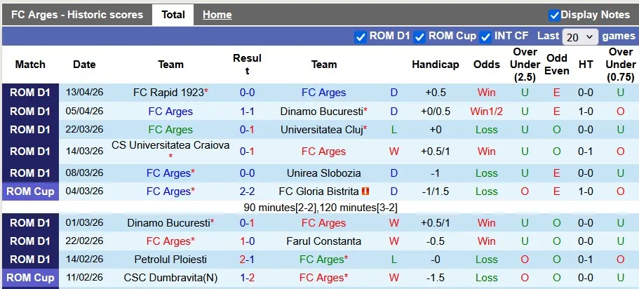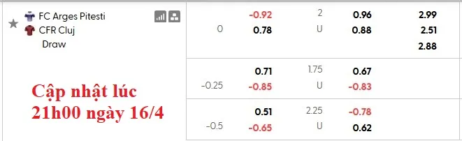 Arges có lợi thế sân nhà, nhưng mức kèo châu Á dành cho họ chỉ là 0:0. Arges thắng kèo châu Á 3/4 trận vừa qua, còn đội khách cũng thắng kèo 7/10 trận. Hai đội cũng tương đối cân bằng (về kèo) với 1 đội 4 và 1 đội 5/10 trận đối đầu vừa qua.