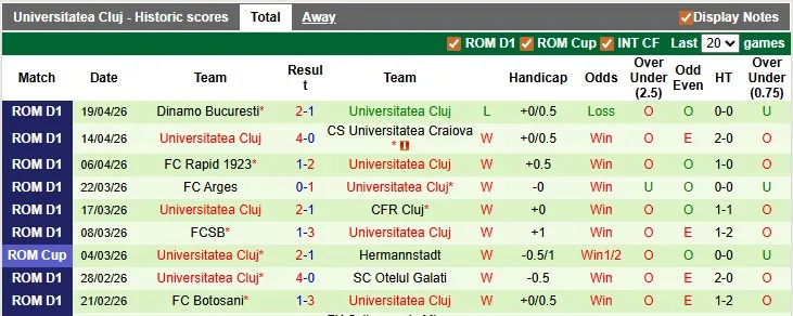Thống kê phong độ 10 trận đấu gần nhất của Universitatea Cluj
