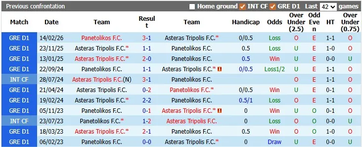 Trong 8 trận đối đầu gần nhất giữa hai đội, có đến 5 trận kết thúc với không quá 2 bàn được ghi. 2 trận gần nhất của Asteras Tripolis và 3/5 của Panetolikos cũng có các kết quả tương tự.
