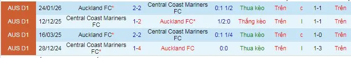 + Auckland thua kèo châu Á cả 2 trận tiếp đón Central Coast Mariners trên sân nhà.