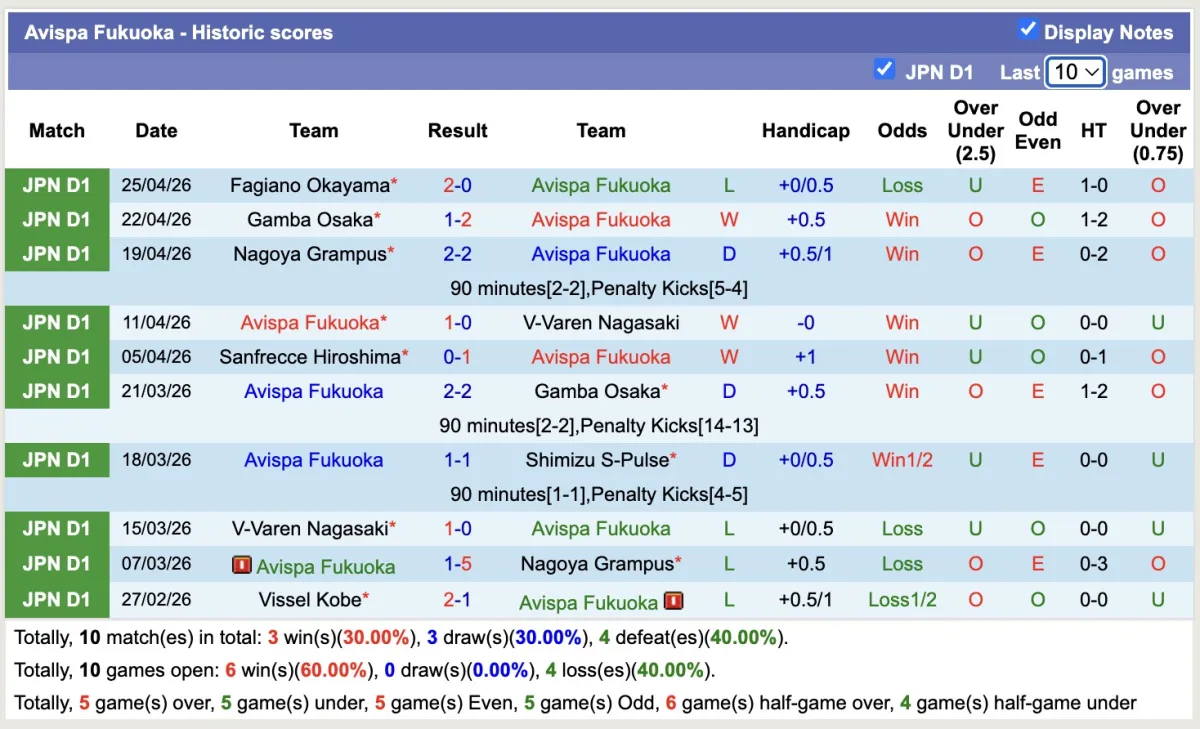 -Thống kê phong độ 10 trận đấu gần nhất của Avispa Fukuoka