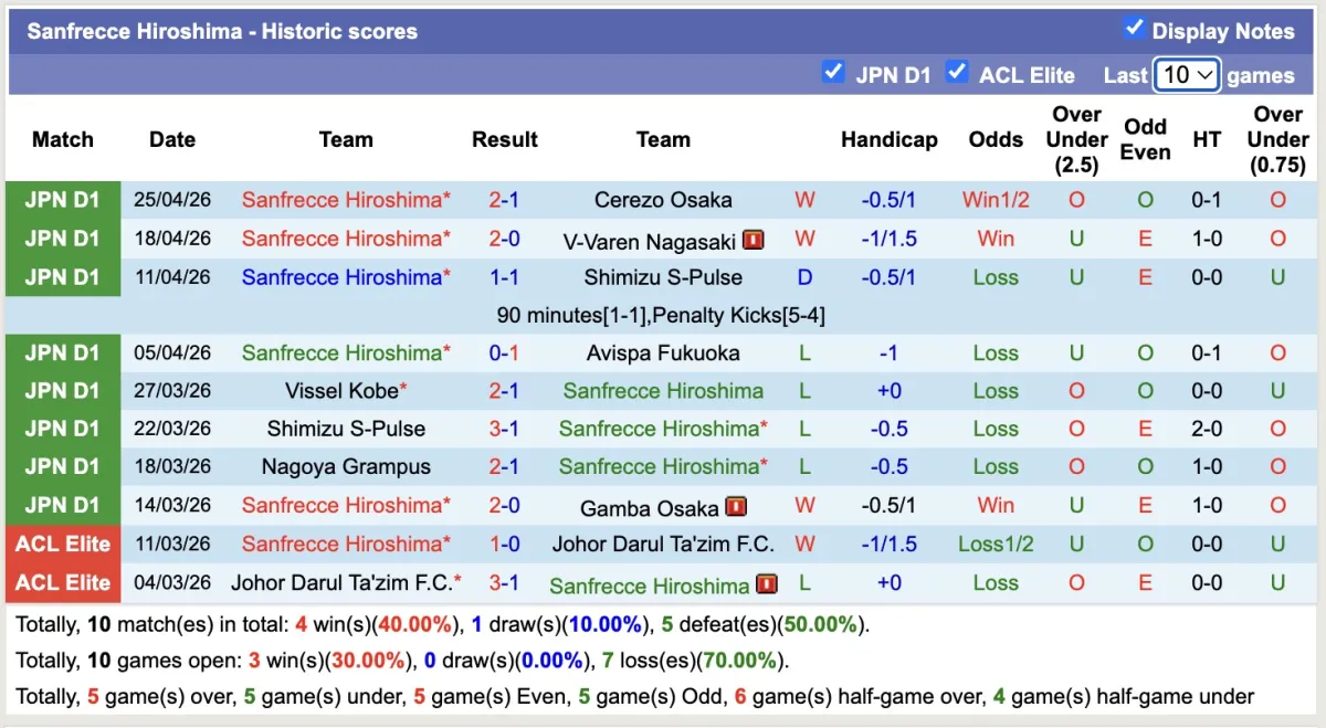 -Thống kê phong độ 10 trận đấu gần nhất của Sanfrecce Hiroshima