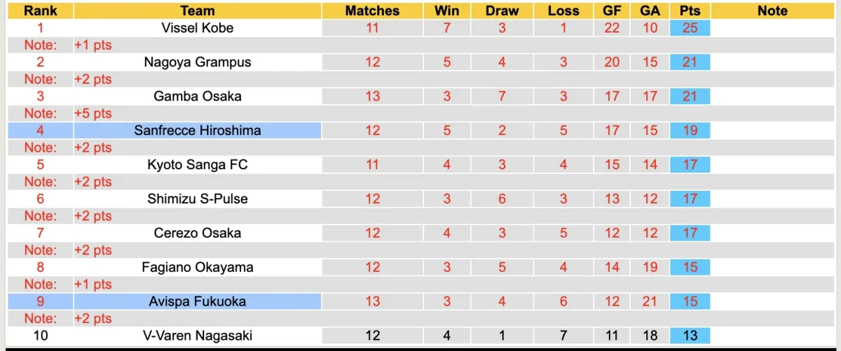 Avispa Fukuoka chỉ là một câu lạc bộ hạng trung khi thành tích lớn nhất trong lịch sử là vô địch J.League Cup năm 2023. Mùa giải năm nay sau 12 vòng đấu đội bóng này chỉ sở hữu 15 điểm và đang đứng thứ 9, kém đối thủ 4 điểm.