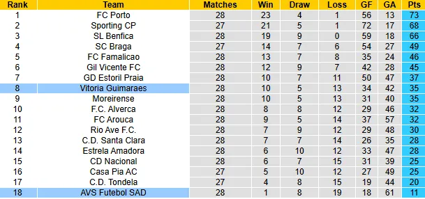 Chạm trán một AVS đang khủng hoảng là cơ hội không thể tốt hơn để Guimaraes xóa đi cái dớp khôn nhà dại chợ (thua 5 trận sân khách gần đây). Dù AVS từng đánh bại Guimaraes ở Cúp Quốc gia hồi tháng 12 năm ngoái nhưng tình thế hiện tại đã thay đổi hoàn toàn. Một bên đang rệu rã và chuẩn bị xuống hạng, một bên đang hưng phấn sau thắng lợi hủy diệt.
