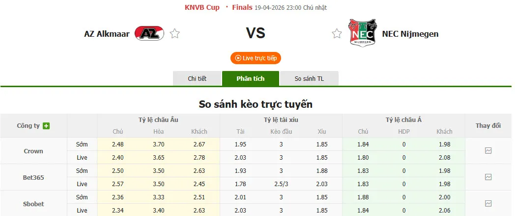 Nhận định soi kèo AZ Alkmaar vs N.E.C. Nijmegen, 23h00 ngày 19/4 tại cúp QG Hà Lan. Phân tích tỷ lệ kèo, dự đoán kết quả AZ Alkmaar đấu với N.E.C. Nijmegen từ tỷ lệ châu Âu, châu Á qua các chuyên gia hàng đầu.