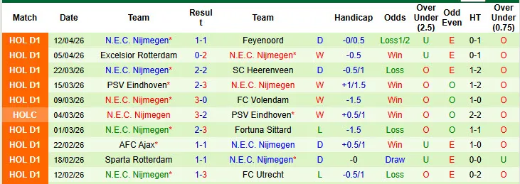 Thống kê phong độ 10 trận đấu gần nhất của N.E.C. Nijmegen