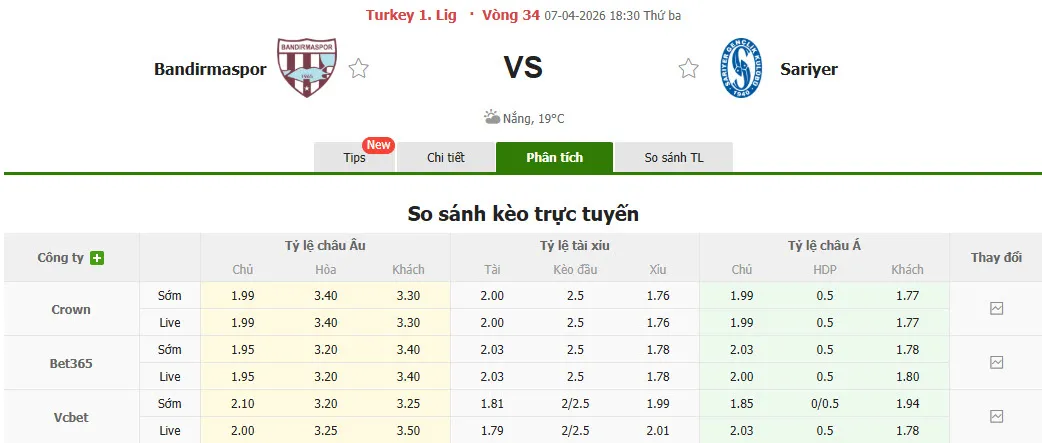 Nhận định soi kèo Bandirmaspor vs Sariyer, 18h30 ngày 7/4 tại hạng Nhất Thổ Nhĩ Kỳ. Phân tích tỷ lệ kèo, dự đoán kết quả Bandirmaspor đấu với Sariyer từ tỷ lệ châu Âu, châu Á qua các chuyên gia hàng đầu.