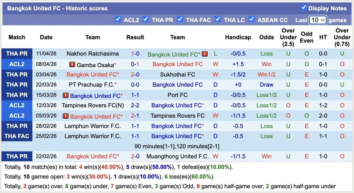 -Thống kê phong độ 10 trận đấu gần nhất của Bangkok United