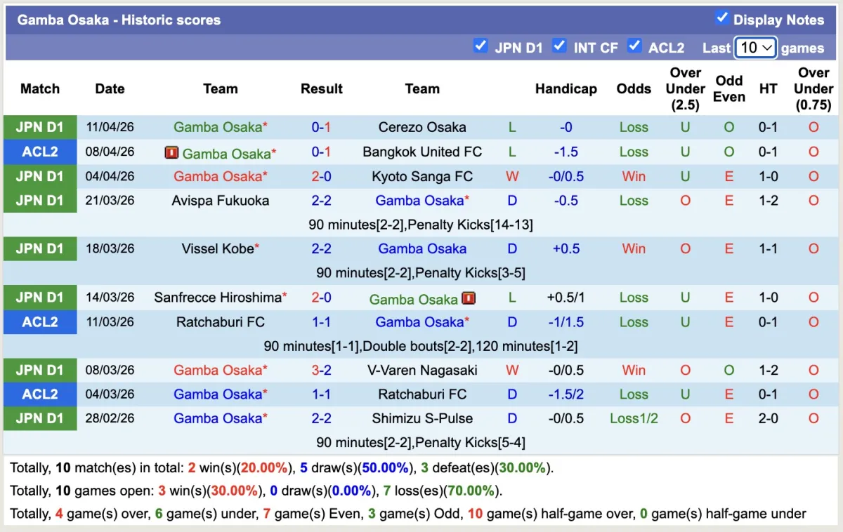 -Thống kê phong độ 10 trận đấu gần nhất của Gamba Osaka
