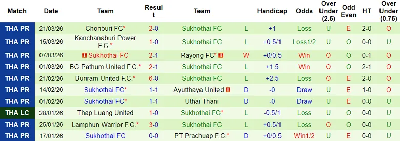 Sukhothai thua toàn bộ 8 trận sân khách gần đây thuộc giải VĐQG Thái Lan. Khả năng cao Sukhothai lại nhận thất bại khi so tài cùng Bangkok United vào thứ Sáu (3/4).