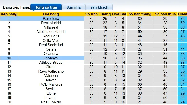 Trên thực tế, Espanyol chưa từng đánh bại Barca tại La Liga kể từ tháng 2/2009, khi họ giành chiến thắng 2-1 tại Camp Nou, điều này cho thấy mức độ khó khăn của trận đấu đối với họ. Không thể phủ nhận một thực tế rằng năm 2026 là một năm rất đáng thất vọng đối với đội bóng áo trắng xanh, khi họ không thể giành chiến thắng trong bất kỳ trận đấu nào kể từ đầu năm với 8 trận thua, 5 trận hòa và tụt xuống vị trí thứ 10, kém đội đứng thứ 6 là Celta Vigo 6 điểm.