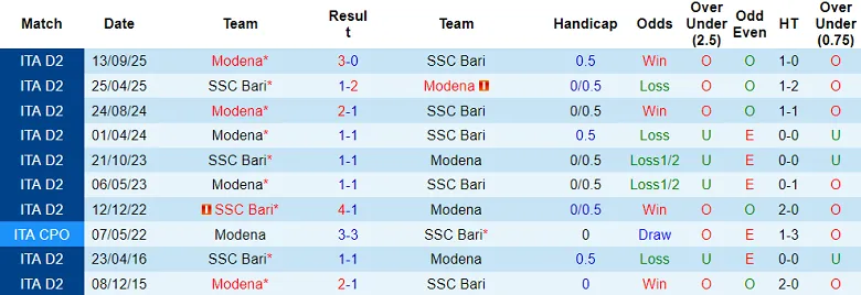 Thống kê phong độ, lịch sử đối đầu của Bari đấu vs Modena