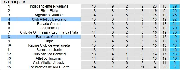 Hiện tại, Barracas Central đang đứng thứ 8 tại bảng B. Điều đó cho phép họ hi vọng vào cuộc đua giành vé dự play-off. Đó sẽ là cuộc chiến của 16 đội top 8 từ mỗi bảng đấu. Khả năng này với Belgrano còn sáng sủa hơn với vị trí thứ tư của họ.