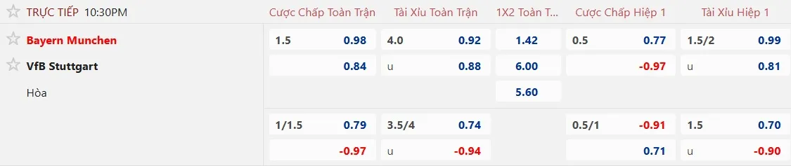 2 trận đối đầu gần nhất trên sân nhà Allianz Arena, Bayern Munich đều chấp dao động từ 1 1/4 đến 1 3/4 trái và giành chiến thắng với cách biệt ít nhất 3 bàn thắng. Trận gần nhất chấp Stuttgart đúng 1 1/2 trái, Hùm xám cũng thắng tưng bừng 5-0. 3 trận gần đây trên mọi đấu trường chấp 1 1/2 trái cũng chứng kiến Bayern Munich vượt handicap thành công. Với Stuttgart, đội bóng này thua kèo 3/4 trận sân khách gần nhất.