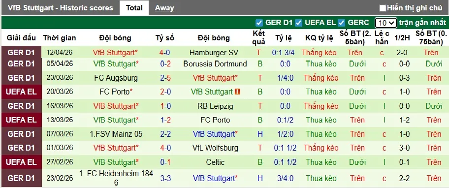 Thống kê phong độ 10 trận đấu gần nhất của Stuttgart