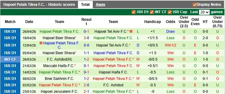 Thống kê phong độ 10 trận đấu gần nhất của Hapoel Petah Tikva