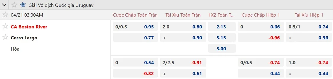 Nhận định soi kèo Boston River vs Cerro Largo, 03h00 ngày 21/4 tại giải VĐQG Uruguay. Phân tích tỷ lệ kèo, dự đoán kết quả Boston River vs Cerro Largo từ tỷ lệ châu Âu, châu Á qua các chuyên gia hàng đầu.