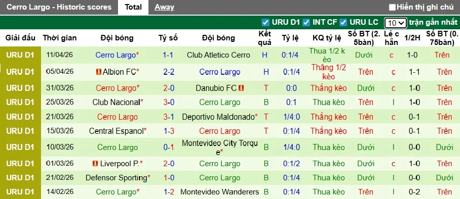 Thống kê phong độ 10 trận đấu gần nhất của Cerro Largo.