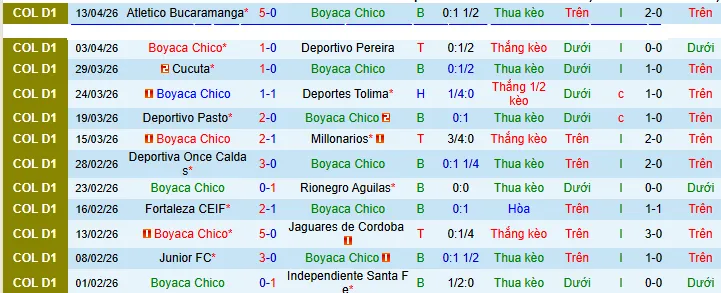 + Boyaca Chico thắng 3 thua 5 hòa 2 trong 10 trận sân nhà vừa qua ở giải VĐQG.