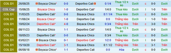 Hai đội đã gặp nhau sáu lần kể từ tháng 11 năm 2023. Boyaco Chico thắng hai trận, Deportivo Cali thắng một trận, và ba trận hòa. Trận đấu gần nhất giữa hai đội diễn ra vào ngày 26 tháng 8 năm 2025, kết thúc với tỷ số hòa 0-0. Trong sáu lần đối đầu này, Boyaco Chico ghi được 3 bàn thắng, trong khi Deportivo Cali ghi được 5 bàn. Nhìn chung, Boyaco Chico có thành tích đối đầu tốt hơn trước Deportivo Cali trong những lần gặp nhau gần đây.