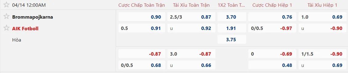 Sàn giao dịch châu Á ghi nhận mức kèo AIK Solna chấp 1/2 trái, cao hơn 2 chuyến làm khách gần nhất của họ tới sân của Brommapojkarna (đều chấp 1/4 trái). Điều này cho thấy các nhà đầu tư đang có niềm tin rất lớn dành cho AIK Solna, đội đã toàn thắng kèo 2 trận đối đầu gần nhất. AIK Solna cũng thắng kèo 3, hòa 1 và chỉ thua 1 ở 5 trận vừa qua.