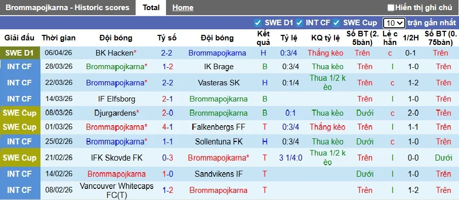 Thống kê phong độ 10 trận đấu gần nhất của Brommapojkarna