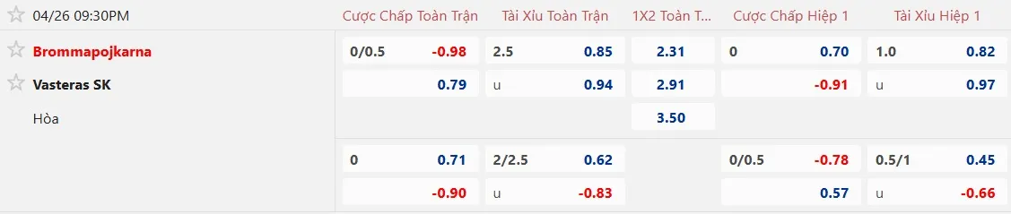 Sàn giao dịch châu Á ghi nhận mức kèo Brommapojkarna chấp 1/4 trái, tỷ lệ mà họ khá có duyên ở những trận đối đầu với Vasteras, khi thắng 3 và hòa 1 trong 4 trận gần nhất gặp nhau. Với thành tích thắng kèo châu Á 3/4 trận đấu từ đầu mùa giải 2026 và ưu thế sân nhà, Brommapojkarna khả năng sẽ vượt handicap thành công.