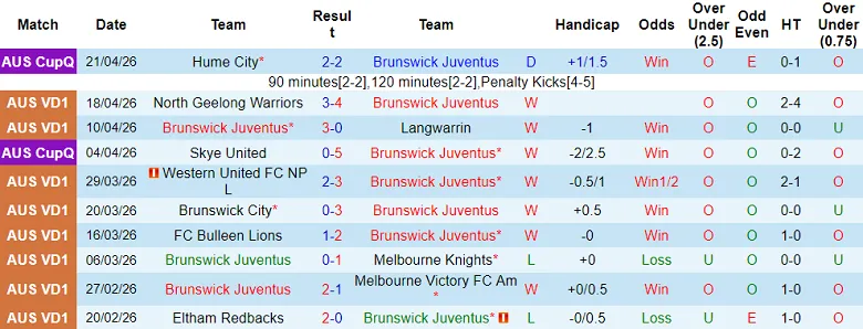 Thống kê phong độ, lịch sử đối đầu của Brunswick Juventus đấu vs North Sunshine