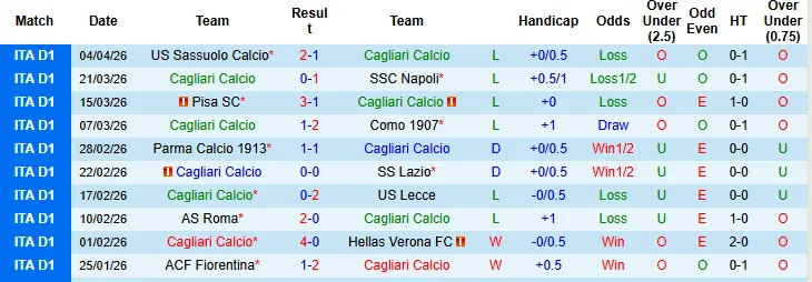Thống kê phong độ 10 trận đấu gần nhất của Cagliari