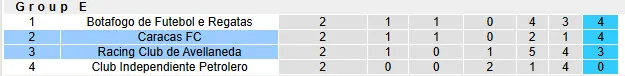 Nhưng trái ngược với những dự đoán từ giới mộ điệu cũng như các chuyên gia Nam Mỹ, thực tế Caracas đã để lại nhiều ấn tượng mạnh sau 2 lượt trận đầu tiên. Chi tiết, đội quân của HLV Fernando Aristeguieta thi đấu chắc chắn khi có được 1 trận hòa trên sân của ông kẹ Botafogo RJ và sau đó là chiến thắng trước Independiente Petrolero (Bolivia) trên sân nhà. Với 4 điểm có được, Caracas tạm thời đứng ở vị trí thứ 2 tại bảng E. Sáng mai, họ tiếp tục được thi đấu sân nhà và lần này đối thủ là đại diện tới từ giải VĐQG Argentina Racing Club de Avellaneda. Tất nhiên, Caracas vẫn được xếp là đội bóng cửa dưới song với đà tâm lý hứng khởi (bất bại 3 trận đấu mới đây) và thêm lợi thế sân nhà, họ tự tin có điểm. Nhắc thêm, Racing Club de Avellaneda không có được sự chuẩn bị tốt nhất khi có một mạch 4 trận đấu không biết mùi thắng lợi tại mọi đấu trường.