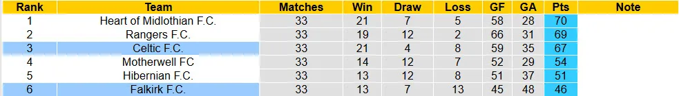 Trên lý thuyết, đây không phải cách biệt quá lớn nhưng với việc vòng bảng tranh vô địch chỉ có 5 lượt trận, Celtic cần phải nỗ lực 200% mới có thể bảo vệ ngôi vương. Đêm nay, họ có trận đấu mở màn vòng bảng tranh vô địch trước Falkirk và đây là cơ hội tốt để đút túi 3 điểm. Nhắc lại, đội chủ sân Celtic Park đang có được đà tâm lý hứng khởi khi vừa đánh bại Saint Mirren ở trận bán kết cúp FA Scotland cách đây ít ngày. Tại giải VĐQG Scotland, Celtic toàn thắng 2 lượt trận mới đây và cho thấy quyết tâm bảo vệ ngôi vương. Trái ngược, Falkirk là đội bóng đứng cuối cùng bảng tranh vô địch với phong độ nghèo nàn. Nên biết, Falkirk chỉ thắng có 1 lần ở 5 trận đấu mới đây tại mọi đấu trường. Lúc này, Falkirk không còn quá nhiều cơ hội cạnh tranh vé tham dự cúp châu Âu và khiến NHM hoài nghi về quyết tâm thi đấu.