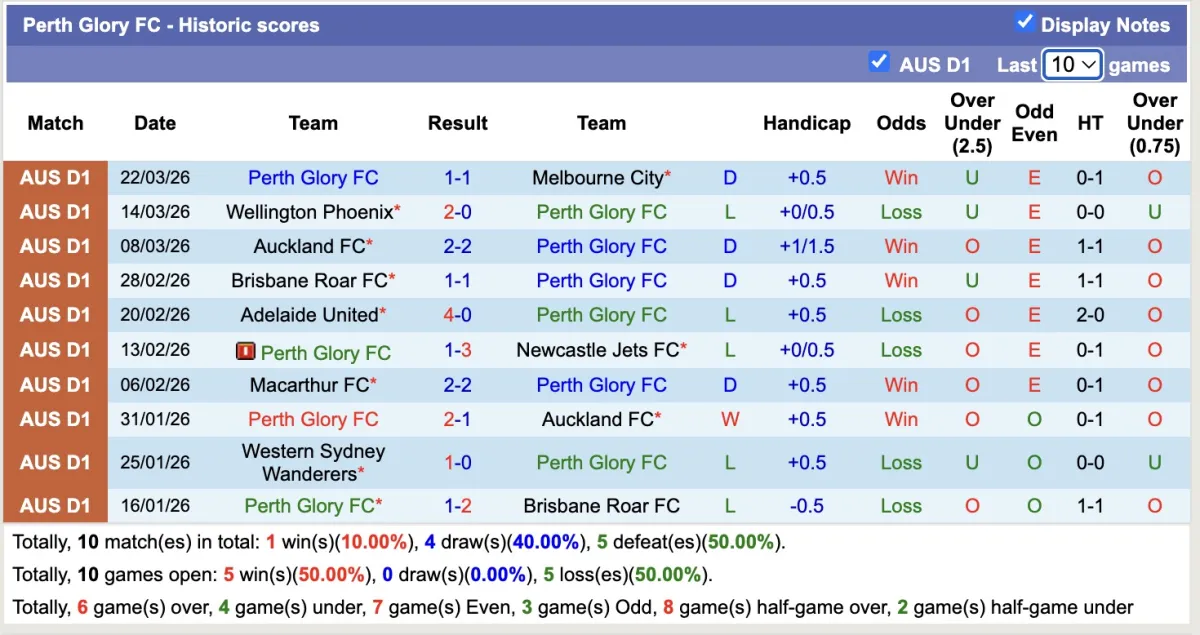 -Thống kê phong độ 10 trận đấu gần nhất của Perth Glory