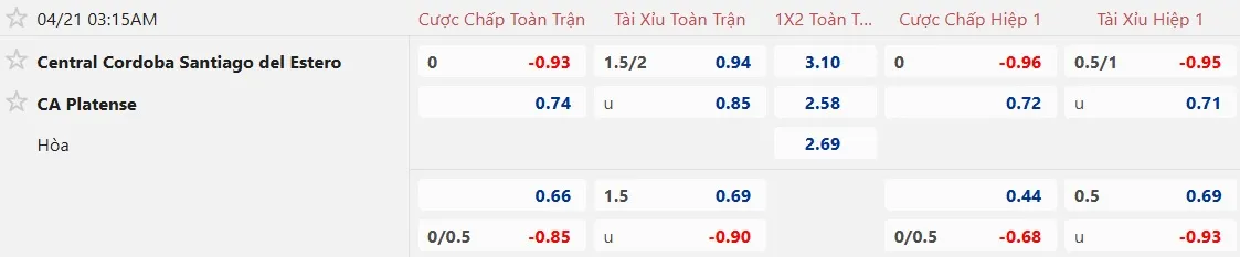 Các cầu thủ Central Cordoba đang có thành tích thắng kèo châu Á 4/5 trận sân nhà gần đây, trong đó có 1 trận cũng xuất hiện mức kèo 0:0 như màn so tài này. Với Atletico Platense, màn thể hiện của đội khách thực sự khiến các nhà đầu tư ôm hận khi để thua kèo châu Á 5/7 trận vừa qua của mình.