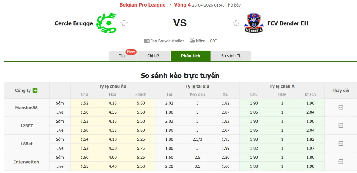 Nhận định soi kèo Cercle Brugge vs Dender, 01h45 ngày 25/4 tại VĐQG Bỉ . Phân tích tỷ lệ kèo, dự đoán kết quả Cercle Brugge đấu với Dender từ tỷ lệ châu Âu, châu Á qua các chuyên gia hàng đầu.