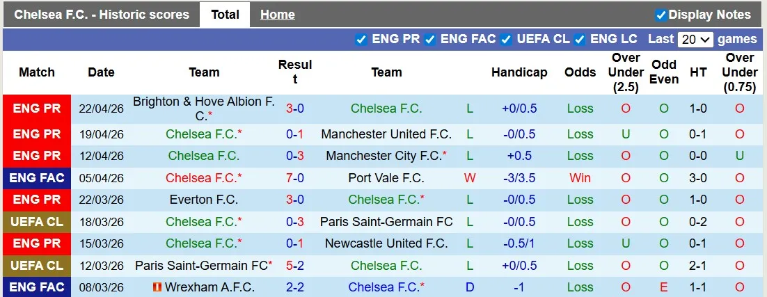 Thống kê phong độ 10 trận đấu gần nhất của Chelsea