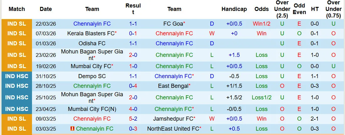 Thống kê phong độ 10 trận đấu gần nhất của Chennaiyin