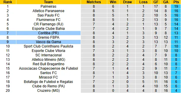 Như đã thông tin ở phía trên, 4/5 trận đối đầu gần nhất giữa hai đội trên sân của Coritiba có tỷ số hoà. Vasco da Gama khó thắng trên sân khách nhưng 3/4 trận xa nhà gần nhất của họ là hoà.