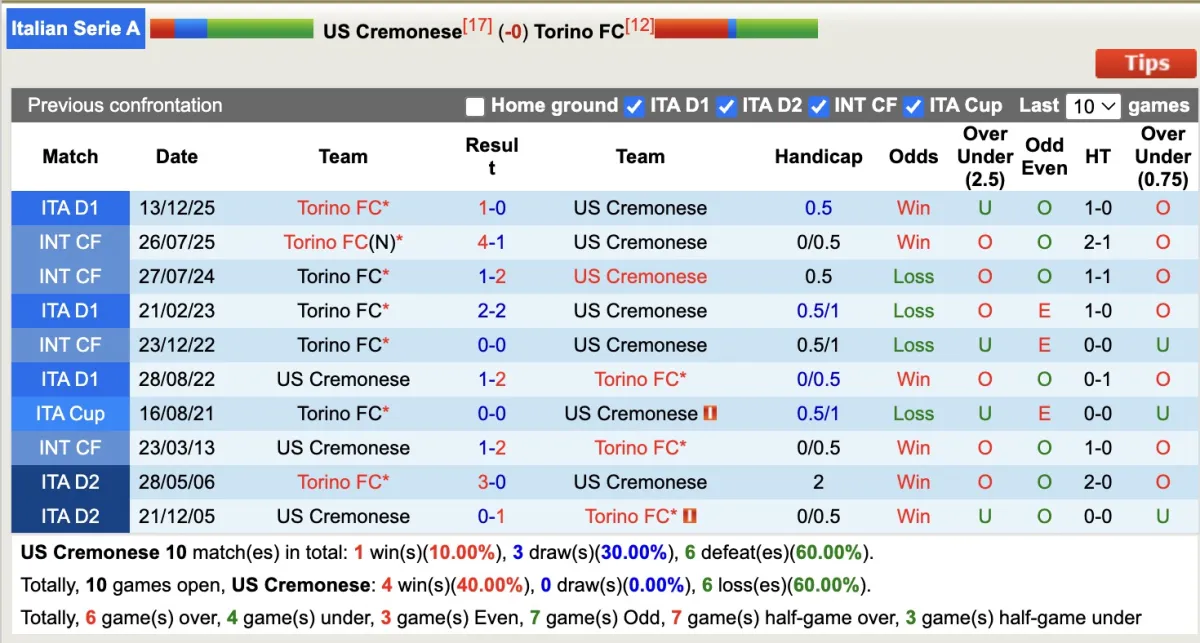 -Thống kê phong độ 10 trận đấu gần nhất của Cremonese