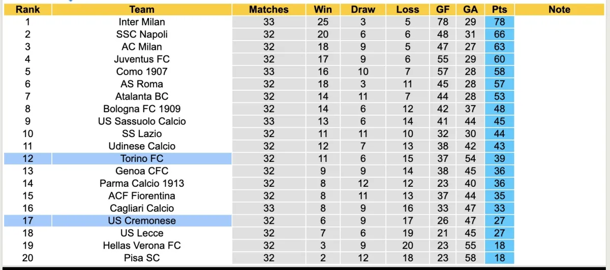 Tính đến thời điểm hiện tại, sau 32 vòng đấu tại giải VĐQG Ý, Cremonese chỉ đang sở hữu vỏn vẹn 27 điểm, bằng điểm Lecce đang nằm trong nhóm cầm đèn đỏ nhưng hơn hiệu số. 18 trận gần nhất đội chủ nhà chỉ giành được 4 điểm.