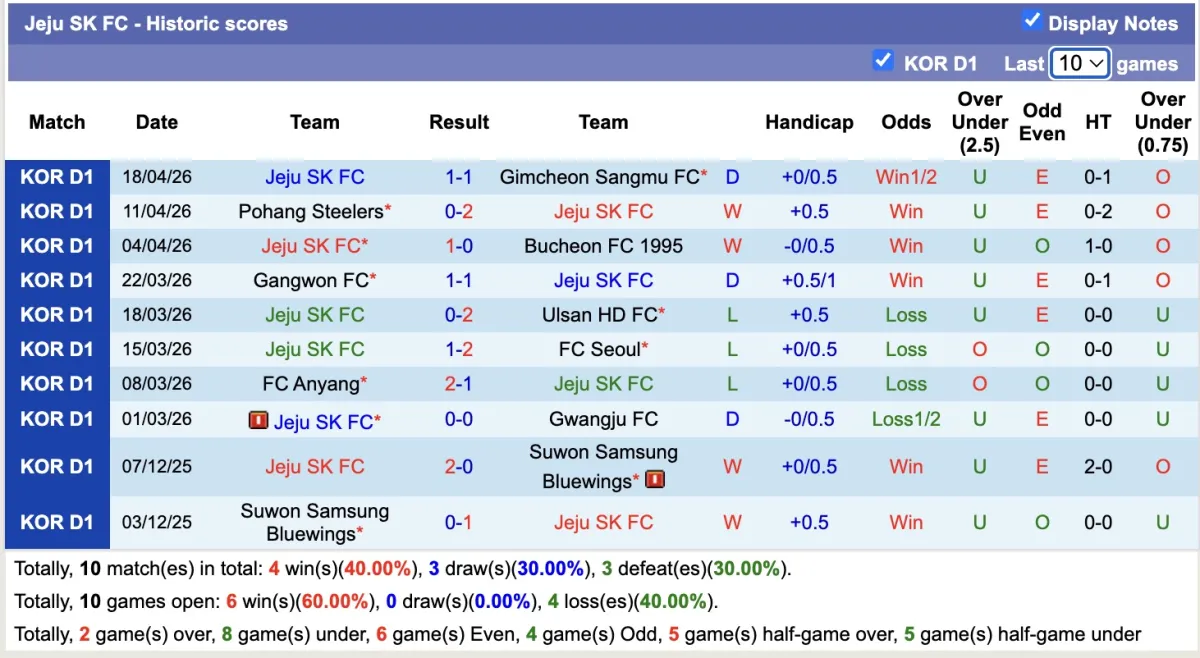 -Thống kê phong độ 10 trận đấu gần nhất của Jeju SK