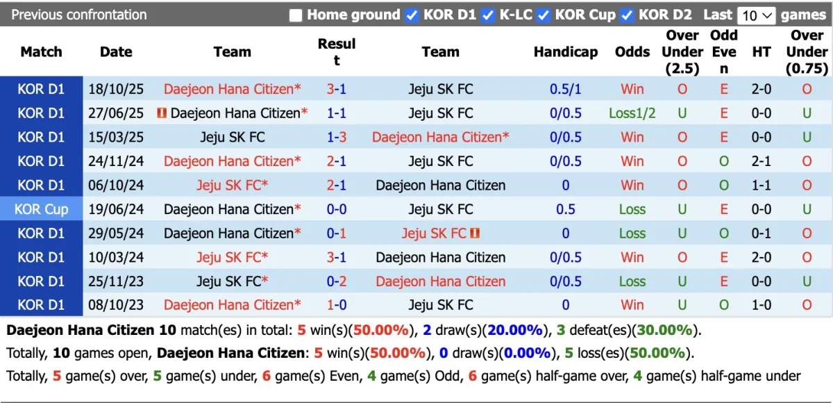 4 trận trên tổ ấm mùa này của Daejeon đều thua kèo. Tính xa hơn 8/10 trận liên tiếp của đội bóng này đều không vượt ải Handicap. 4 vòng đấu gần nhất Jeju SK đều thắng kèo nên có thể đặt niềm tin vào đội khách ở kèo châu Á.