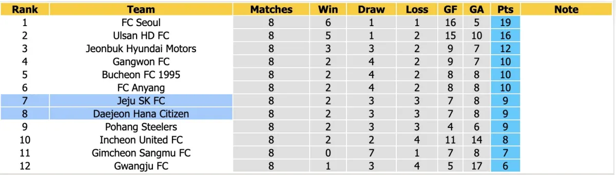 Ở vòng đấu gần nhất Daejeon giành chiến thắng với tỉ số sát nút 1-0 trước đội bóng đang dẫn đầu bảng FC Seoul. Đây là thắng lợi sau 3 vòng đấu liên tiếp đều phải nhận những trái đắng của đội chủ nhà, hiện họ đang đứng thứ 8 trên BXH.