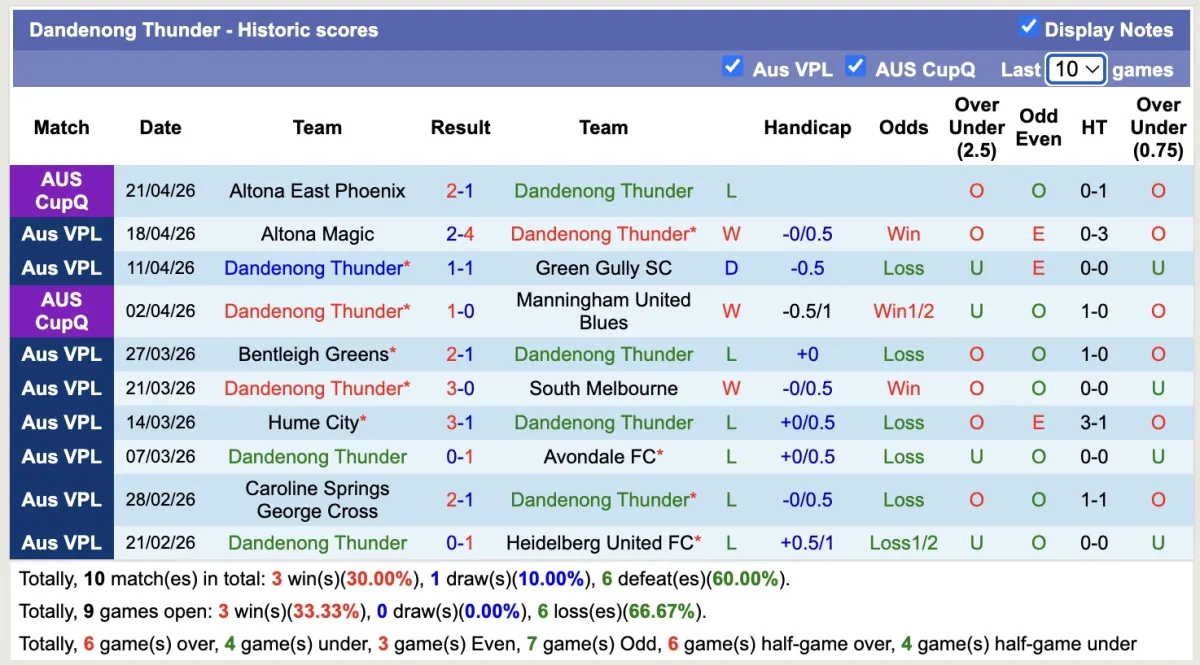 -Thống kê phong độ 10 trận đấu gần nhất của Dandenong Thunder