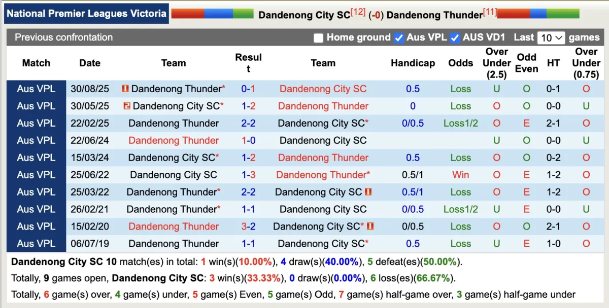 Lần đối đầu gần nhất giữa hai câu lạc bộ, Dandenong Thunder dù được đánh giá cao hơn nhưng đã nếm thất bại. Dandenong City SC đang chơi tốt khi hai trận gần đây đều thắng, 4/5 trận làm khách liên tiếp của Dandenong Thunder đều thua, có lẽ đội khách sẽ nếm trái đắng.