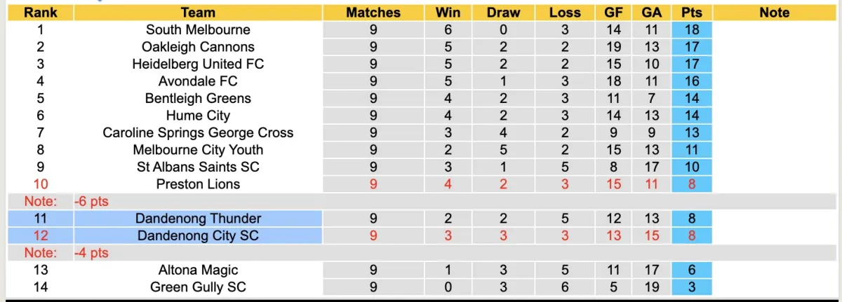 Ở mùa giải năm nay, Dandenong City SC đang bị phạt 3 điểm. Sau 9 vòng đấu đội bóng này chơi không quá tệ khi có 3 chiến thắng, hoà 3 và thua 3. Nhưng với chỉ 8 điểm đang có được đội chủ nhà hiện đang đứng thứ 12/14.